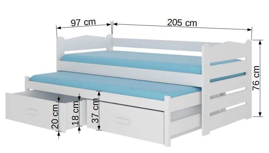 Le lit du bas et les 2 coffres de rangement sur roulettes se glissent sous le lit du haut. Ces 2 couchages de 90×200 cm, permettent Ă vos enfants de dormir confortablement et en toute quiĂ©tude.