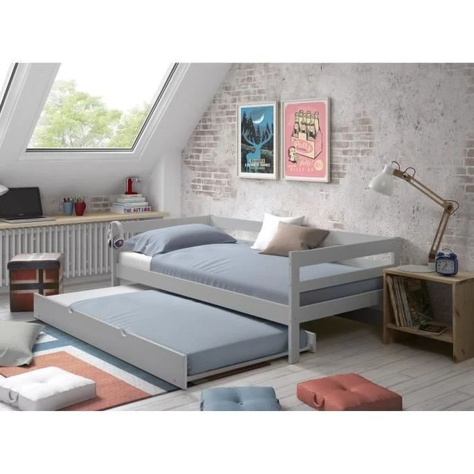 SIMBA Lit Gigogne Enfant Classique En Bois Pin Massif Verni Et Gris Clair – L 90 X L 190 Cm